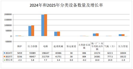 同比2024年,2025年特种设备数量变化较大的是气瓶增加24.9%、场(厂)内专用机动车辆增加10%、电梯增加7.7%、压力容器增加5.8%、起重机械增加3.4%,大型游乐设施、锅炉、压力管道略有减少。
