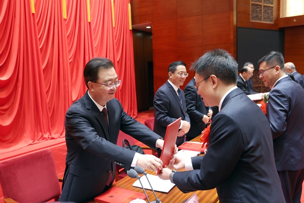 省委书记王宁为获得2024年度云南省科学技术杰出贡献奖的云南大学教授张喜光颁奖并讲话。省委副书记、省长王予波主持会议,省委副书记石玉钢、省政协主席刘晓凯出席。与会省领导为各奖项获奖代表颁奖。云南农业大学教授田洋代表获奖者发言。